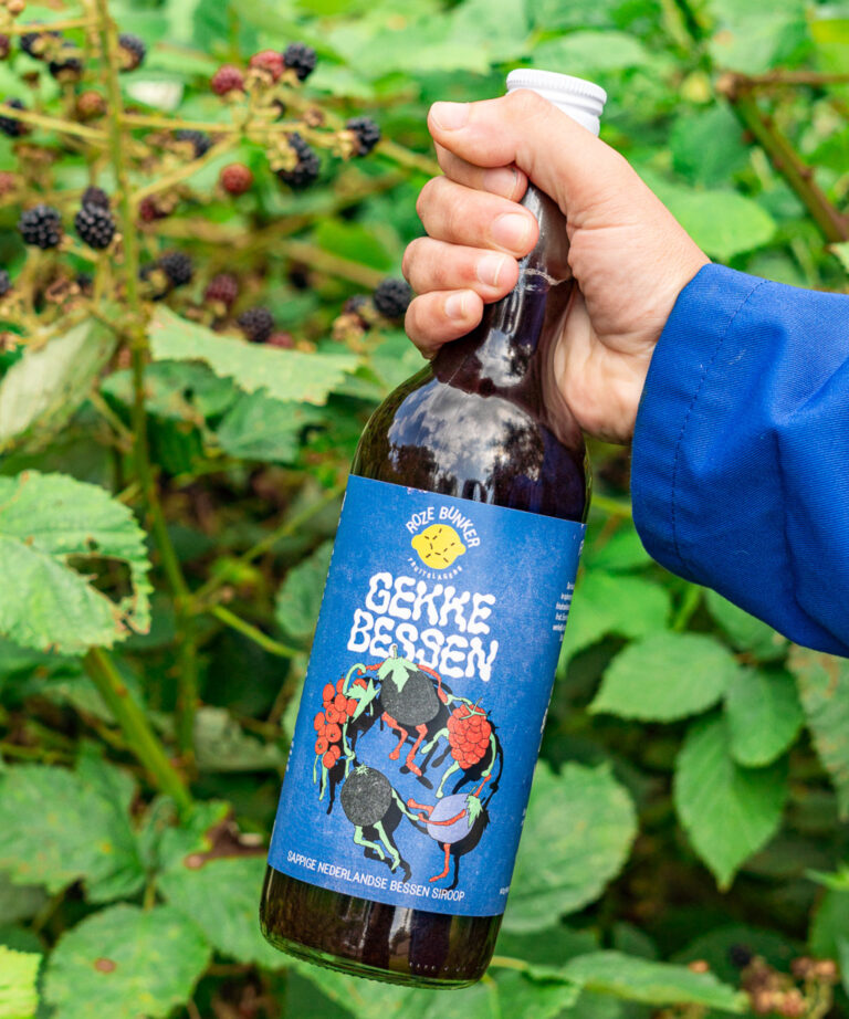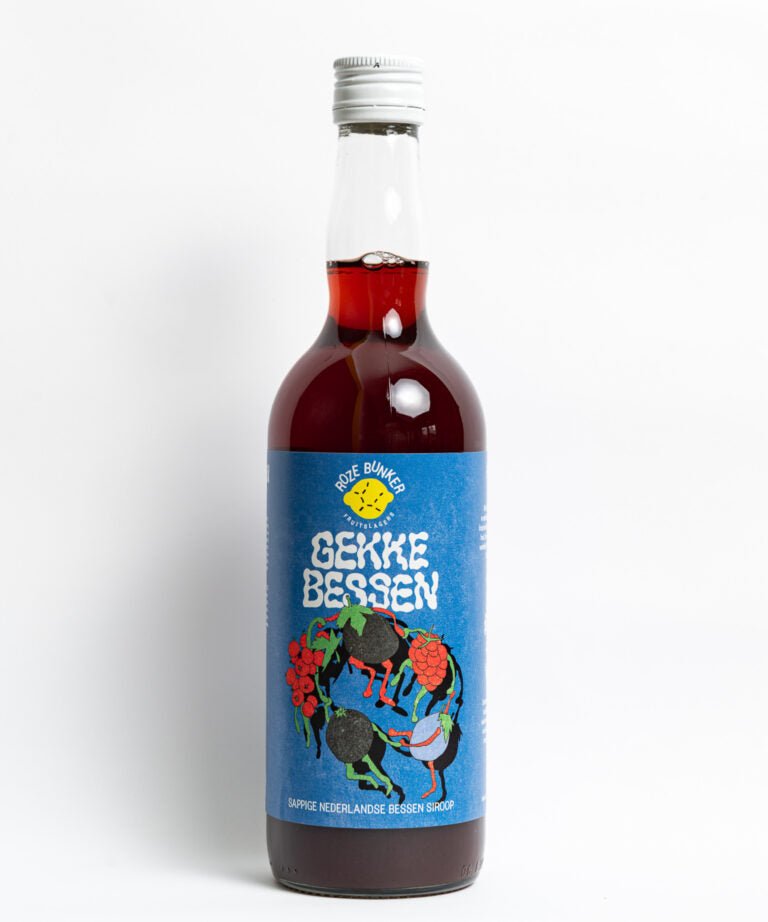 Sappige Nederlandse Bessen Siroop. Smakelijke reststromen zwaaien hier de scepter. Denk aan zwarte bessen, witte en rode aalbessen, appelbes, vossenbes.. net afhankelijk van wat de lokale boer ons biedt. Sommige bessen wijken af van het ideaalplaatje, maar ain’t no such thing! De fruitslagers vinden gekke bessen juist te gek. Gekke Bessen is een ode aan het hele spectrum van de Nederlandse bessenwereld. Een siroop gemaakt van bessen die normaal gesproken geweigerd worden, omdat ze er net wat anders uitzien. Die moeten we juist hebben! Zo brouwen de fruitslagers een Nederlandse cassis.